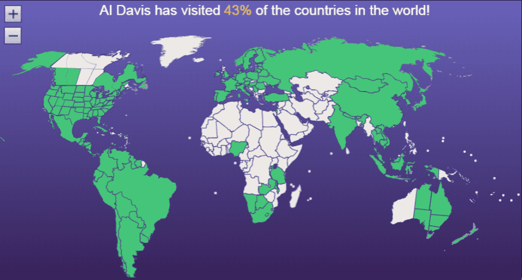 Over the past 40 years, my wife and I have traveled to 93 countries. On rare occasions, we travel as "usual" tourists, but mostly we look for paths less traveled: living with headhunters in Kalimantan, sleeping on the ice on Antarctica, stalking Bengal tigers in Nepal on elephant-back, living in Nigeria for 6 weeks, or finding indigenous peoples in Central Guyana. This map shows the countries we've traveled to.